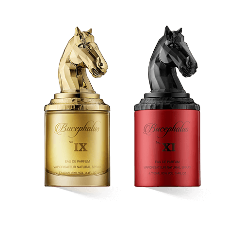 Die Flakons selbst sind mit ihrer zylindrischen Form eher schlicht gehalten, wobei jedes Parfum eine eigene Farbgestaltung aufweist. Auf der Vorderseite des Flakons befindet sich ein Aufdruck mit dem Markennamen und der Duftbezeichnung. Das eigentliche Highlight der Flakons ist die Verschlusskappe, die einem Pferdekopf nachempfunden ist und ein wenig an eine Schachfigur erinnert. Dieses aufwendig gestaltete Element macht das Design der exklusiven Kollektion nicht nur absolut einzigartig, sondern stellt auch eine optische Verbindung zur Inspiration der Düfte, dem Schlachtross Bucephalus, her.