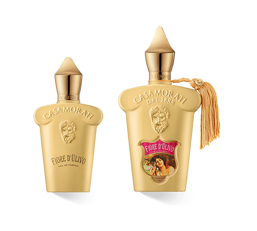 Auf dem Werbeplakat von Casamorati Fiore d'Ulivo leuchtet der gold-gelbe Flakon in überdimensionierter Größe. Eine Frau hält den Flakon, der größer als ihr Kopf ist, mit zwei Händen neben ihrem Oberkörper. Nicht nur der Flakon zieht die Blicke auf sich, auch die Frau. Sie steckt in einem weißem Spitzenkleid mit grafischem Muster und weiten Ärmeln, doch das auffälligste ist die Perücke, die sie trägt. Sie erinnert an den ausgefallenen Kopfschmuck von Marie-Antoinette, der als Turmfrisur in die Geschichte einging. Den Kopf der Frau ziert eine voluminöse Perücke aus feinem, weißem Stoff, der sich in Falten nach oben bewegt. Das Ende der Perücke sehen wir nicht. Oben im Bild ist der Ansatz einer gelben Rose zu sehen, daneben zieren weiße Stoffblüten diesen extravaganten Kopfschmuck.