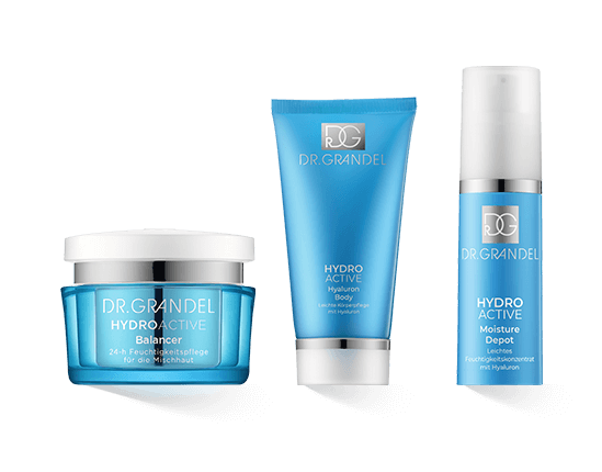 Intensive Feuchtigkeitspflege für verschiedene Hauttypen bietet die Dr. Grandel Hydro Active Kollektion. Verschiedene Formeln helfen gezielt trockene und reife, aber auch öligere Haut mit langhaltender Feuchtigkeit zu versorgen und die Feuchtigkeitsdepots der Haut aufzufüllen. Ebenso kann sie geglättet werden, sie erscheint praller und voller Frische. Dazu wird der Klassiker Hyaluronsäure durch besondere Biotechniken in neuen Formen gebracht. Dieses Filler Hyaluron dringt optimal in die Haut ein. So kann es an genau den richtigen Stellen Feuchtigkeit abgeben und maximale Ergebnisse erzielen.