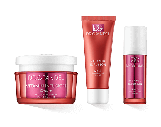 Angenehm leichte Texturen wie das Dr. Grandel Vitamin Infusion Gel sorgen bereits bei der Anwendung für ein revitalisiertes Gefühl. Die Geltextur ist zudem für feuchtigkeitsarme, Mischhaut und auch Männerhaut gut geeignet. Eine reichhaltigere Feuchtigkeitspflege mit Lipiden ist die Vitamin Infusion Cream. So lässt sich die Pflegeserie auf verschiedene Hauttypen abstimmen.