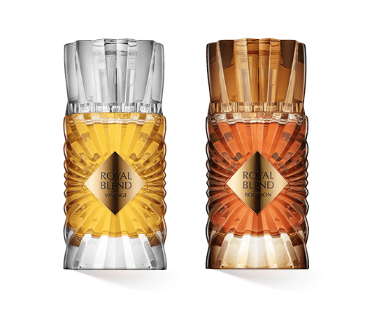 Das Design der Flakons unterstreicht den luxuriösen Anspruch der Kollektion. Die schweren, opulenten Flakons erinnern an edle Kristallkaraffen und klassische Spirituosengefäße. Das dicke, strukturierte Glas erzeugt eine markante Kristalloptik, die das Licht facettenreich reflektiert. Die zylindrische Form wirkt klar, elegant, leicht gestreckt und modern. Massive Verschlüsse, die teils transparent sind und teils farblich auf den Duft abgestimmt sind, runden das hochwertige Erscheinungsbild ab und schaffen eine visuelle Verbindung zur warmen, holzbetonten Duftwelt von Royal Blend.