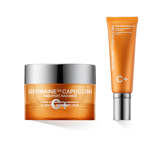 Germaine de Capuccini Timexpert Radiance C+ umfasst insgesamt vier verschiedene Pflegeprodukte. Diese können einzeln gezielt gegen bestimmte Hautprobleme angewendet werden. Besonders bedürftige Haut erhält das Optimum an aufbauender Pflege bei aufeinander abgestimmter Verwendung von Emulsion, Creme und Serum.