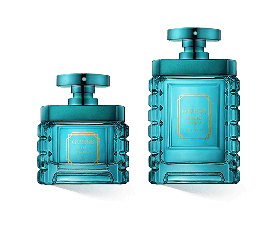 Der Flakon von Guess Uomo Acqua sticht mit seiner cyanblauen Farbe sofort ins Auge. Kühl, strahlend und klar wirkt der Flakon, dessen Glas kunstvoll geschliffen ist. Der goldene Schriftzug in der Mitte der Front veredelt den Flakon, der an eine Hausfassade erinnert. Ein metallisch schimmerndes Ornament schließt den Flakon ab, unterschiedlich große Zylinder bilden den Sprühkopf, der in ein flaches, an ein Rad erinnerndes Element integriert ist. Das Design symbolisiert die kühlen, erfrischenden Noten des Eau de Toilette sowie den edlen Charakter des Duftes.