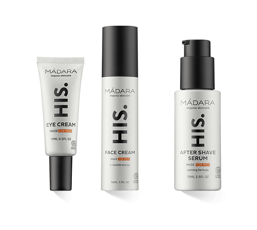 MÁDARA HIS ist eine Gesichtspflege in Bio-Qualität speziell für Männerhaut. Männerhaut hat eine andere Zusammensetzung als Frauenhaut, deshalb ist eine spezielle Pflege sinnvoll. Sie ist dicker und fettiger und benötigt im Vergleich weniger fetthaltige Cremes, dafür aber mehr entzündungshemmende Inhaltsstoffe.