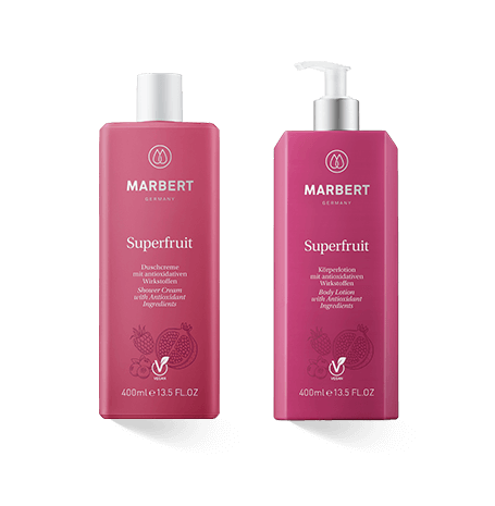 Die Marbert Superfruit Körperpflege reinigt, pflegt und schützt die Haut. Im Mittelpunkt der Wirkformel stehen die sogenannten Superfrüchte. Granatapfel, Brombeere und Blaubeeren sind nicht nur als Essen reich an Nährstoffen, Vitaminen und vor allem Antioxidantien. Sie können ebenso die Haut unterstützen und helfen, ihren Schutz und ihre Funktionen aufrecht zu erhalten. Dazu werden weitere ausgewählte Inhaltsstoffe kombiniert. Weizenproteine haben eine beruhigende Wirkung und helfen der Haut, zu regenerieren. Panthenol spendet Feuchtigkeit und hilft zugleich, diese langanhaltender zu speichern.