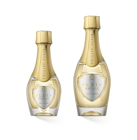 Die Gestaltung des Flakons ist typisch Philipp Plein. Sie fällt auf. Philipp Plein Fatale steckt in einem Flakon, der aussieht wie eine Champagnerflasche, was natürlich auf die Exklusivität und die Lebensfreude dieses Duftes anspielt. Fatale feiert jeden Moment und ist anregend wie prickelnder Champagner. Die abgerundete Form verkörpert das Feminine des Duftes, die goldene Farbe vermittelt den Wert des Parfums sowie dessen Eleganz. Auf einer weißen, goldumrahmten Plakette sehen wir das Logo sowie den Namen des Duftes. Damit wirkt der Flakon optimistisch, edel und positiv.