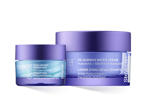 Die Pflegeserie Strivectin Advanced Hydration besteht aus der Re-Quench Water Cream mit Hyaluronsäure und Elektrolyten für die tägliche, ölfreie Hydratation, der Hyaluron-Tripeptid-Gel-Creme für die Augen und dem Lactic Acid Nightly Retexturizing Serum für Nachts, außerdem dem Hyaluronic Acid Dual-Response Serum und dem 3-in-1-Daily Glow Toner mit Aleo vera, Hyaluron- und Milchsäure.