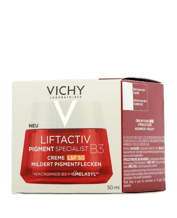 Die Pigment Specialist B3 SPF 50 Creme von Vichy Liftactive reduziert Pigmentflecken und Falten bei Frauen ab 40. Bereits bestehende dunkle Flecken auf der Haut werden aufgehellt, während ein spezieller Wirkstoff-Komplex die Neuentstehung verhindert. Der hohe Lichtschutzfaktor der Creme schützt die Haut täglich vor UV-Strahlen und wirkt effektiv gegen vorzeitige Hautalterung.